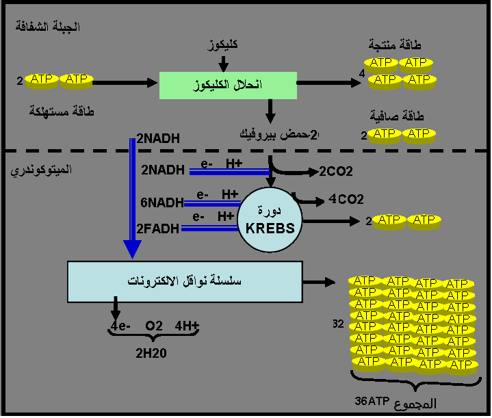 نظريا نحصل على 38ATP لكن في الواقع نحصل على 36ATP فقط لأن نواقل NADH الناتجة في الجبلة الشفافة لا تدخل إلى الميتوكوندري و لكن تعوض بنواقل FADH 2 باستثناء خلايا القلب و الكبد حيث تعوض بنواقل NADH .